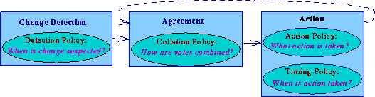 The first component of the project is developing a conceptual model for adaptive distributed systems. In the model, the adaptation process is divided into three phases: change detection, agreement, and action. The change detection phase might, for example, involve monitoring message flow between sites or sending control/test messages to the change detection processes on other sites. The change could also be initiated by the user or the application. The agreement phase is often some kind of distributed agreement algorithm, for example, a majority vote or agreement on maximum value. In some cases, an expensive distributed agreement protocol can be replaced by the decision of central coordinator, or each site can make a decision independently of others. The action phase can range from simply modifying the timeout period for a network protocol or reassigning roles in a primary/backup fault-tolerance scheme to taking corrective action, such as aborting deadlocked computations, or even changing the algorithm used to provide the service.