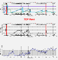 Select the following icon to see a trace of the current implementation of TCP (TCP Reno) running in x-sim. The protocol is transfering a 1MByte file. The topmost graph tracks various protocol parameters, with the the congestion window given by the light-blue line. The middle graph tracks the average throughput rate measured every 12 packets. The vertical red lines in both the top two graphs represent packets that are dropped. The bottom graph shows the transmission rate of the background traffic that was running during the test. This traffic was generated using tcplib.