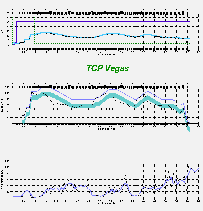 The output represented by the following icon shows the same information as before, but this time for a new implementation of TCP (TCP Vegas). In this case, the second graph is replaced by one that plots the measured throughput rate (black line) against a range (very thick blue-green line) that the congestion mechanism is using to control this rate. When the observed rate falls below this range, Vegas decreases the congestion window (the observed throughput rate is too far from what one would expect given the current congestion window, meaning we are sending too fast). When the observed rate goes above this range, Vegas increases the congestion window (the observed throughput rate is too close to what one would expect given the current congestion window, meaning the network has room to absorb additional packts). When the observed rate is contained within the range, Vegas leaves the congestion window unchanged.